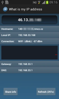 - external IP (IPv4 + IPv6) - hostname - local IP - gateway, DNS - (for wireless connection) signal strength graph